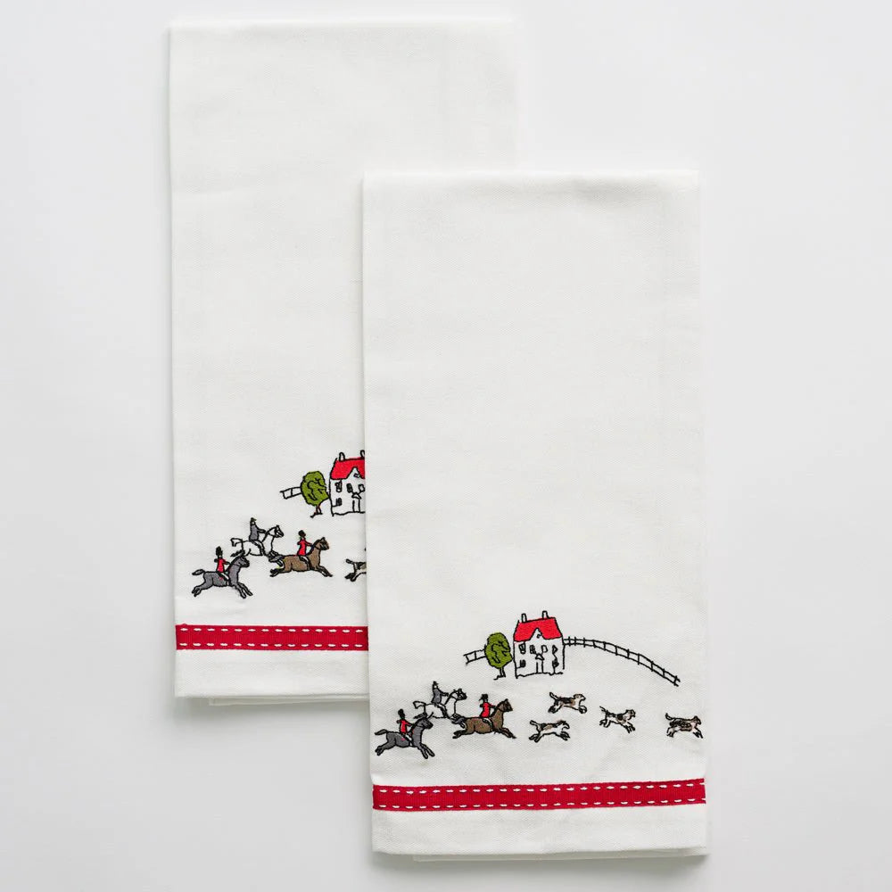 Transform your kitchen into a sophisticated haven of style with our exquisite Embroidered Hunt Red Ribbon Tea Towels. At the heart of these towels lies a captivating equestrian hunt scene, masterfully embroidered with rich, intricate details. Every stitch captures the grace and energy of a thrilling horseback chase, transporting you to the world of equestrian elegance right in your kitchen. The scene is elegantly framed by a striking red ribbon border, adding a touch of regal charm to the overall design.