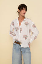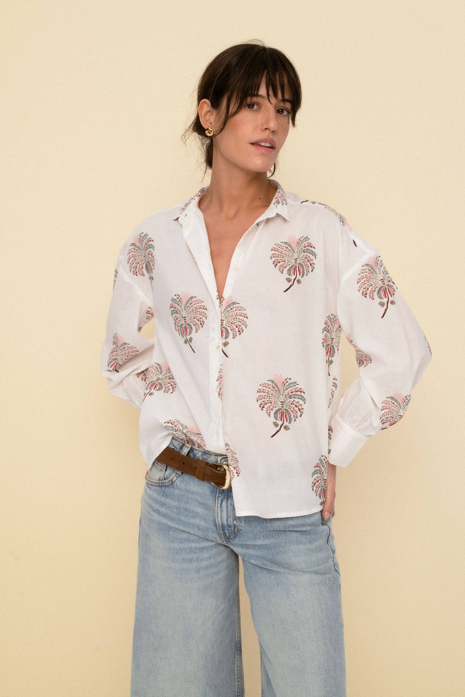 Tailored in a soft lightweight cotton voile , this new style is one of our favorite It is an oversized button-down blouse with stand collar and loose fit , full-length sleeves and mother-of-pearl buttons Wear it loose or tuck it into a skirt or a denim It features one of your loved print.