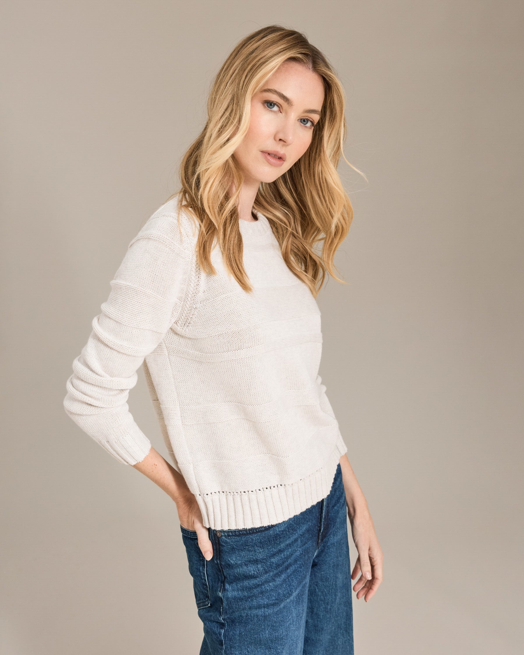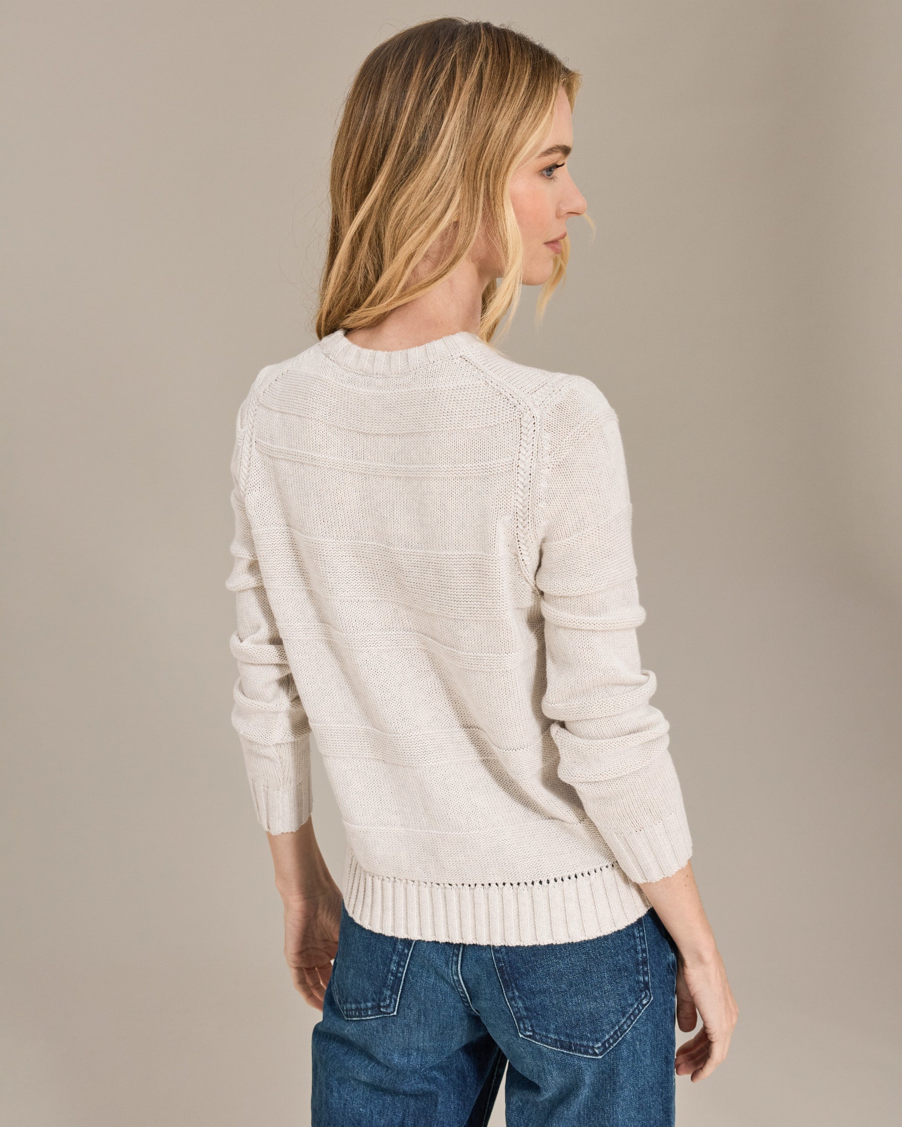 Elevate your everyday wardrobe with this refined pullover, crafted from a luxurious blend of fine cotton and Inner Mongolian cashmere in an 8-ply yarn. The sophisticated textured stripe pattern adds visual interest while maintaining understated elegance. Designed with a classic crew neck and long sleeves, this piece offers both comfort and style. At 21 inches in body length, it's proportioned for a flattering fit. Perfect for layering or wearing solo, this pullover transitions seamlessly from casual to polished occasions.
