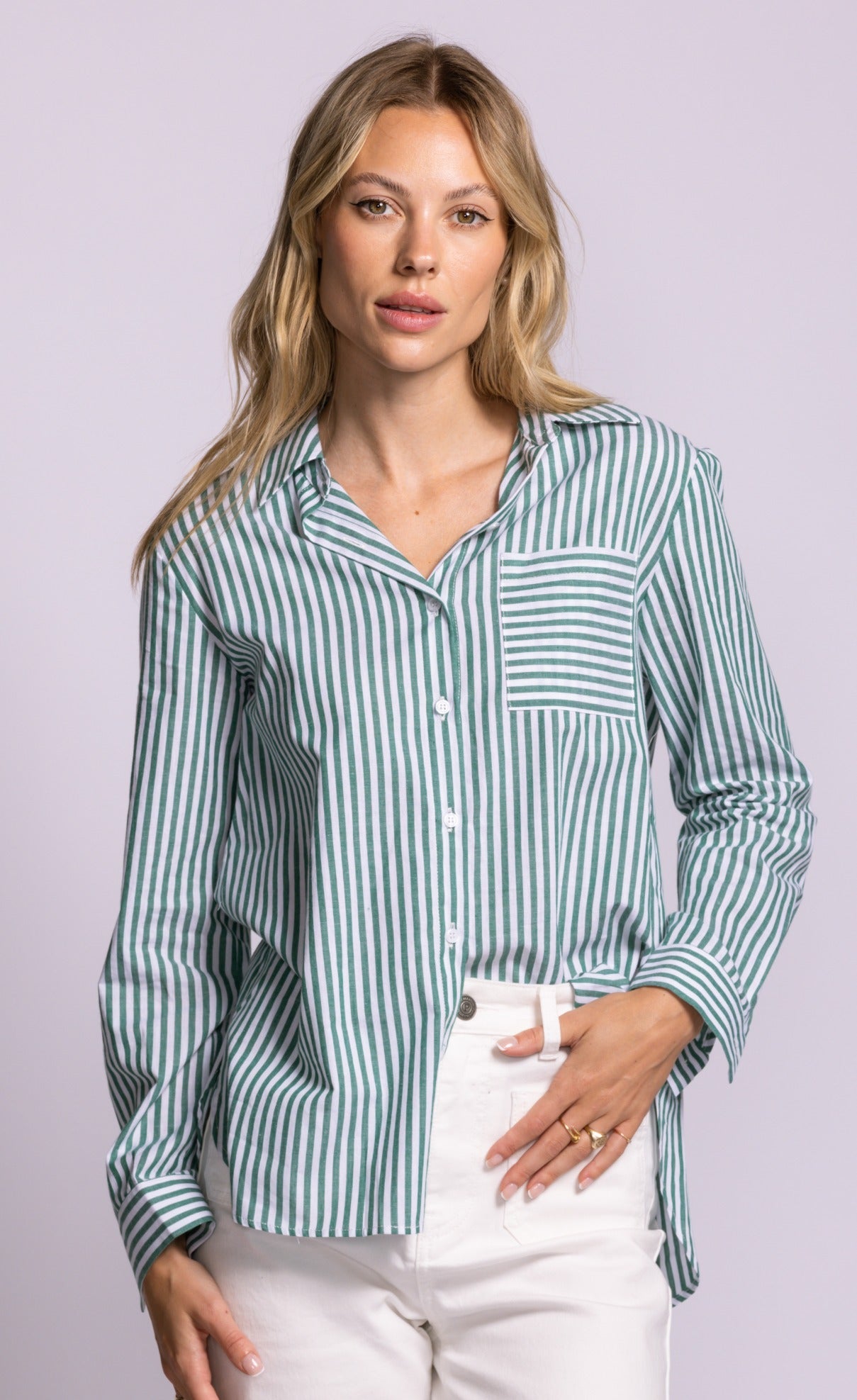 The Dorit Top is a striped cotton button-down shirt featuring a classic collar, cuffs, and a front pocket. Made from 100% cotton, this striped shirt delivers an easy, elevated feel—perfect tucked into jeans or layered over a tank for an effortlessly polished look.