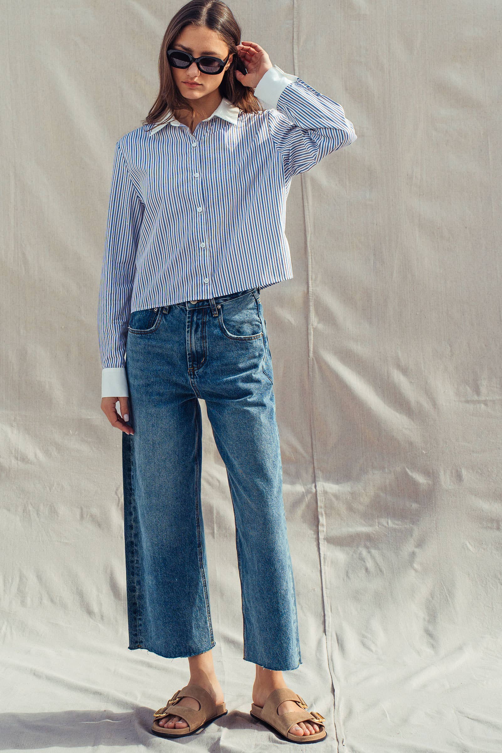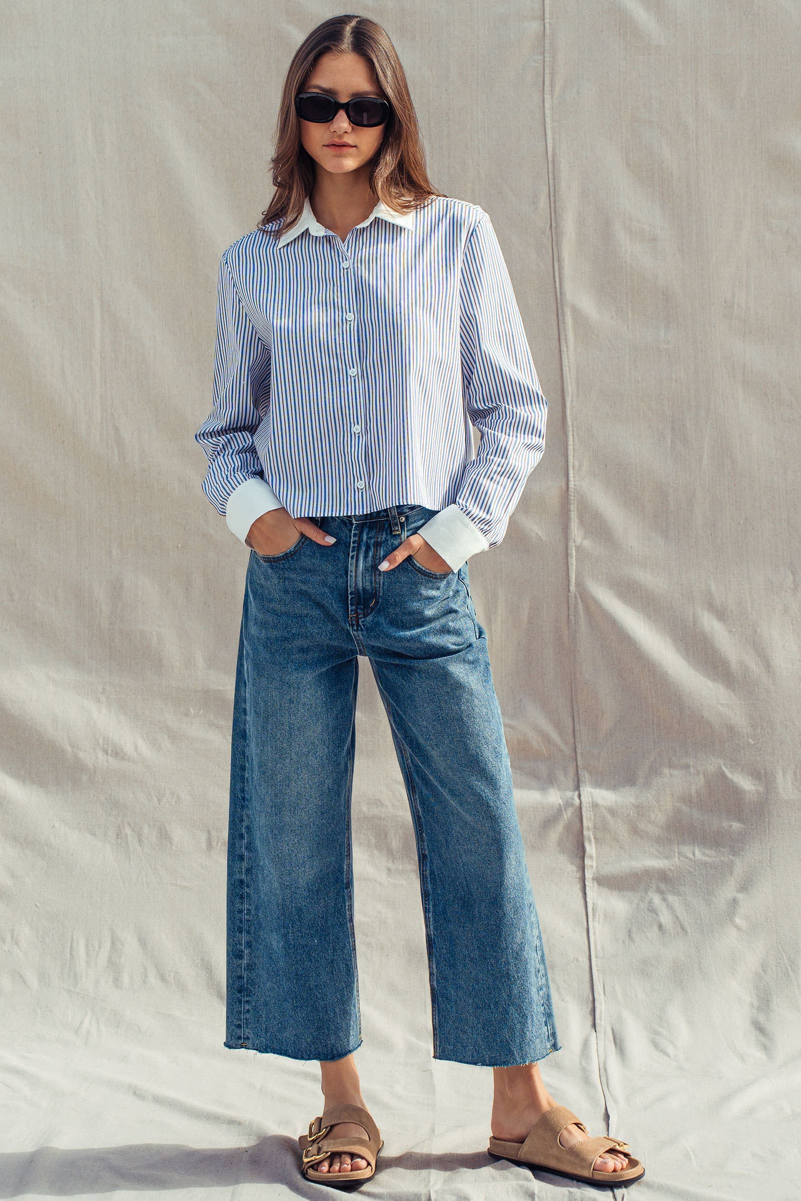 This tailored button-down features a sophisticated blue and brown vertical stripe pattern, accented by a crisp white contrast collar and cuffs. Made from 100% cotton, its relaxed fit pairs perfectly with jeans or denim skirts, offering a polished look that fits seamlessly into a modern western apparel wardrobe.
