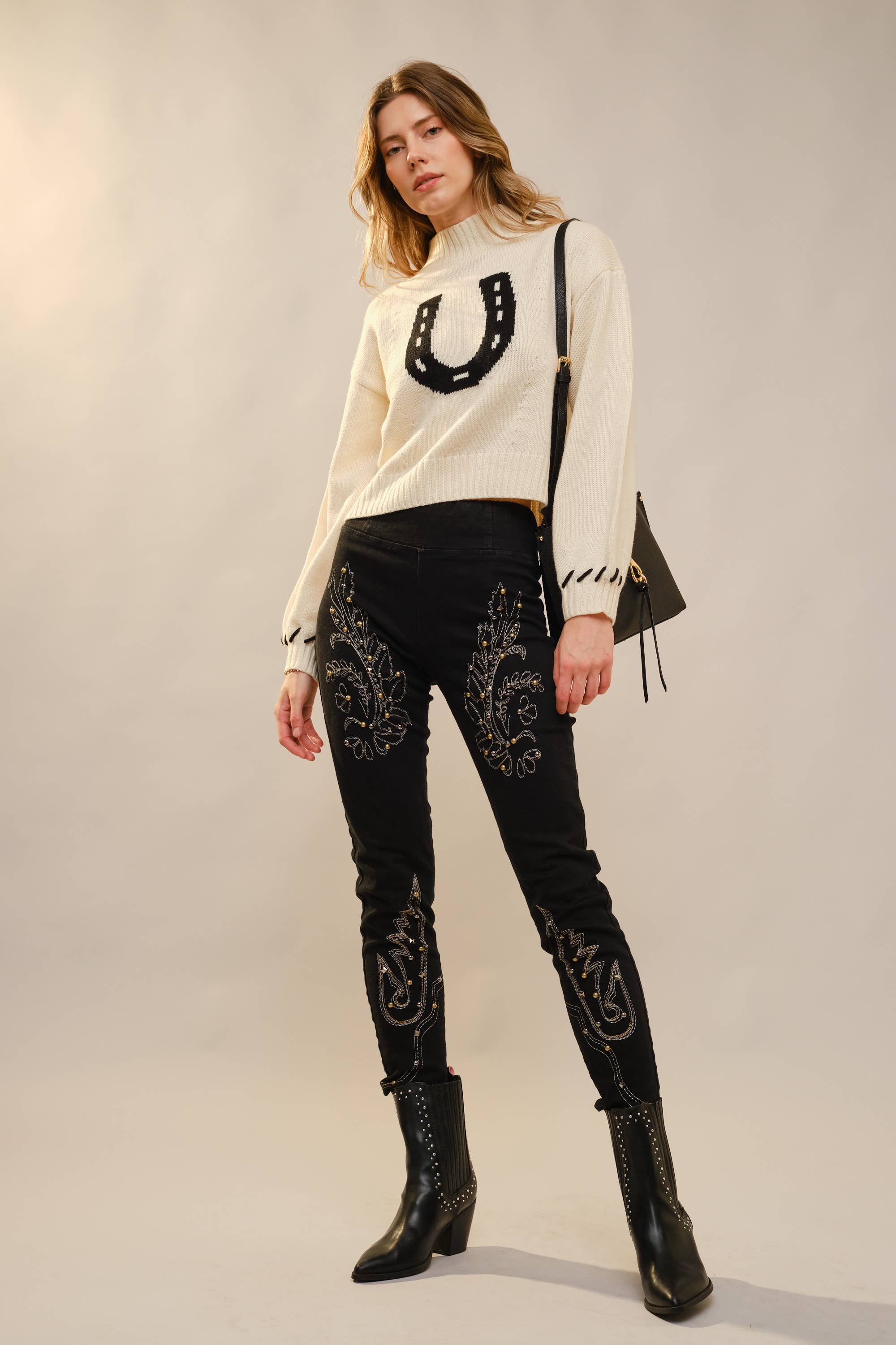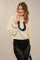 Indulge in the luxurious comfort of our Cropped Horseshoe Knit Sweater. Featuring a bold horseshoe graphic, mock neck, and balloon sleeves with contrast whipstitch details, this sweater exudes sophistication. Crafted from 100% acrylic, it offers both style and warmth. Perfect for any fashion-forward individual.