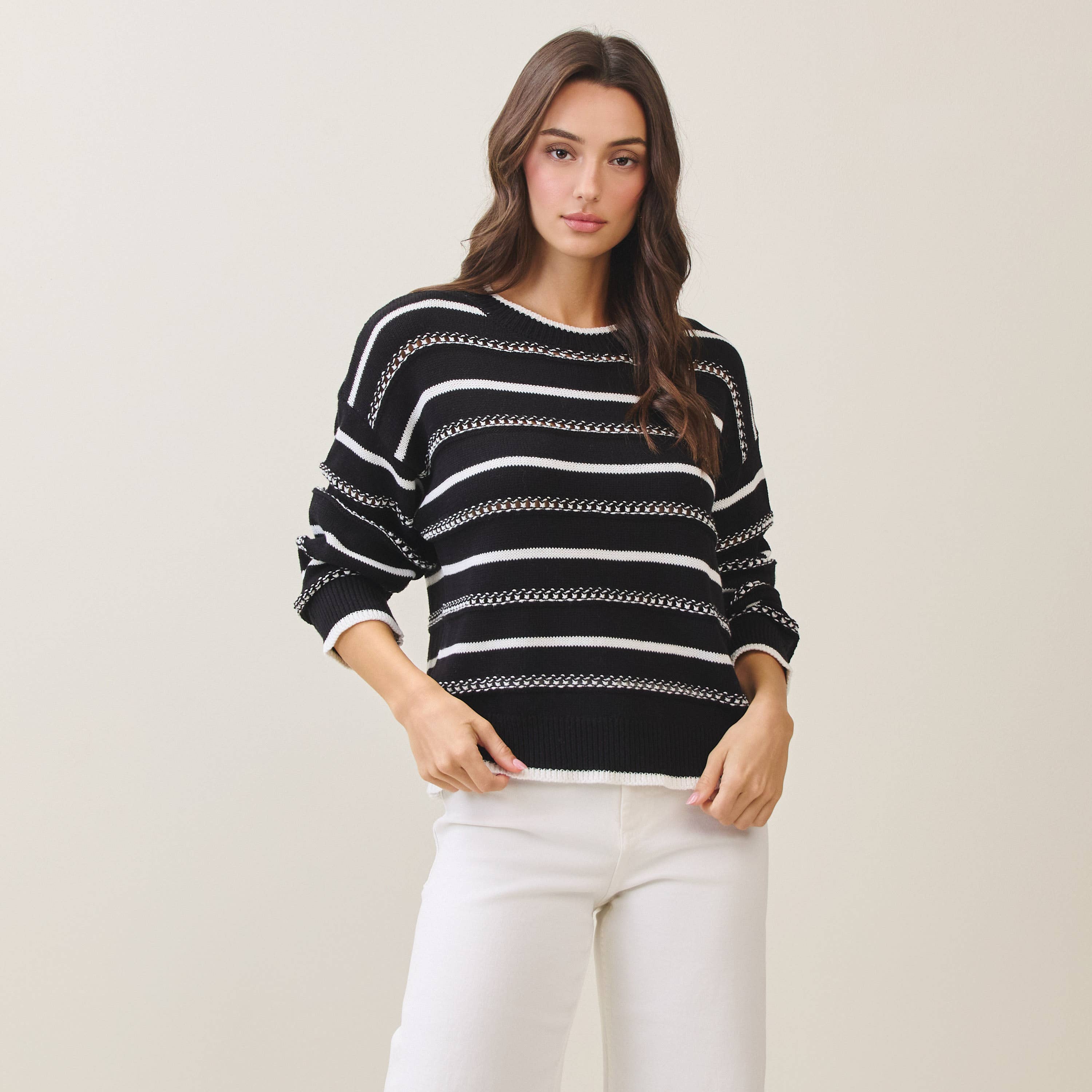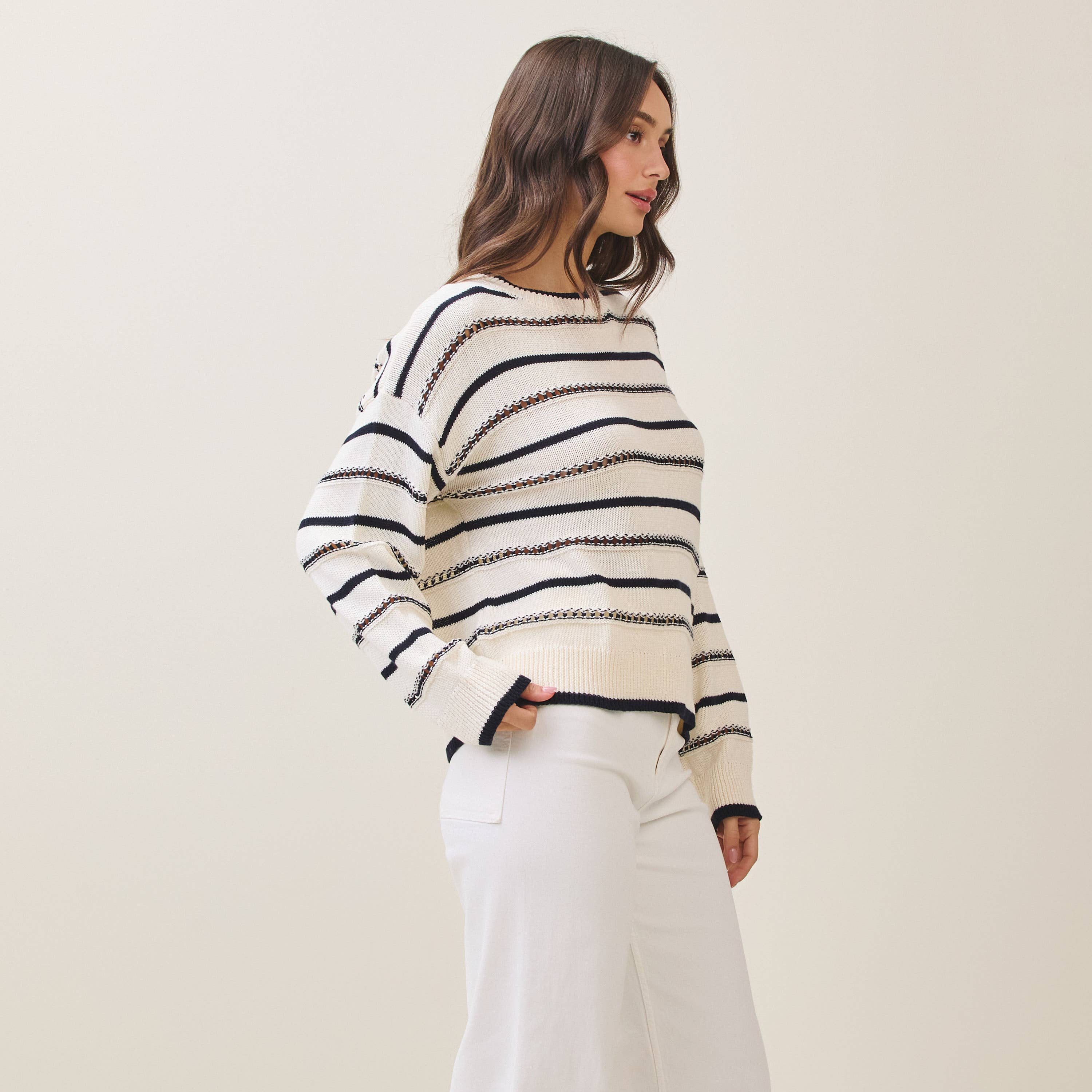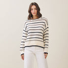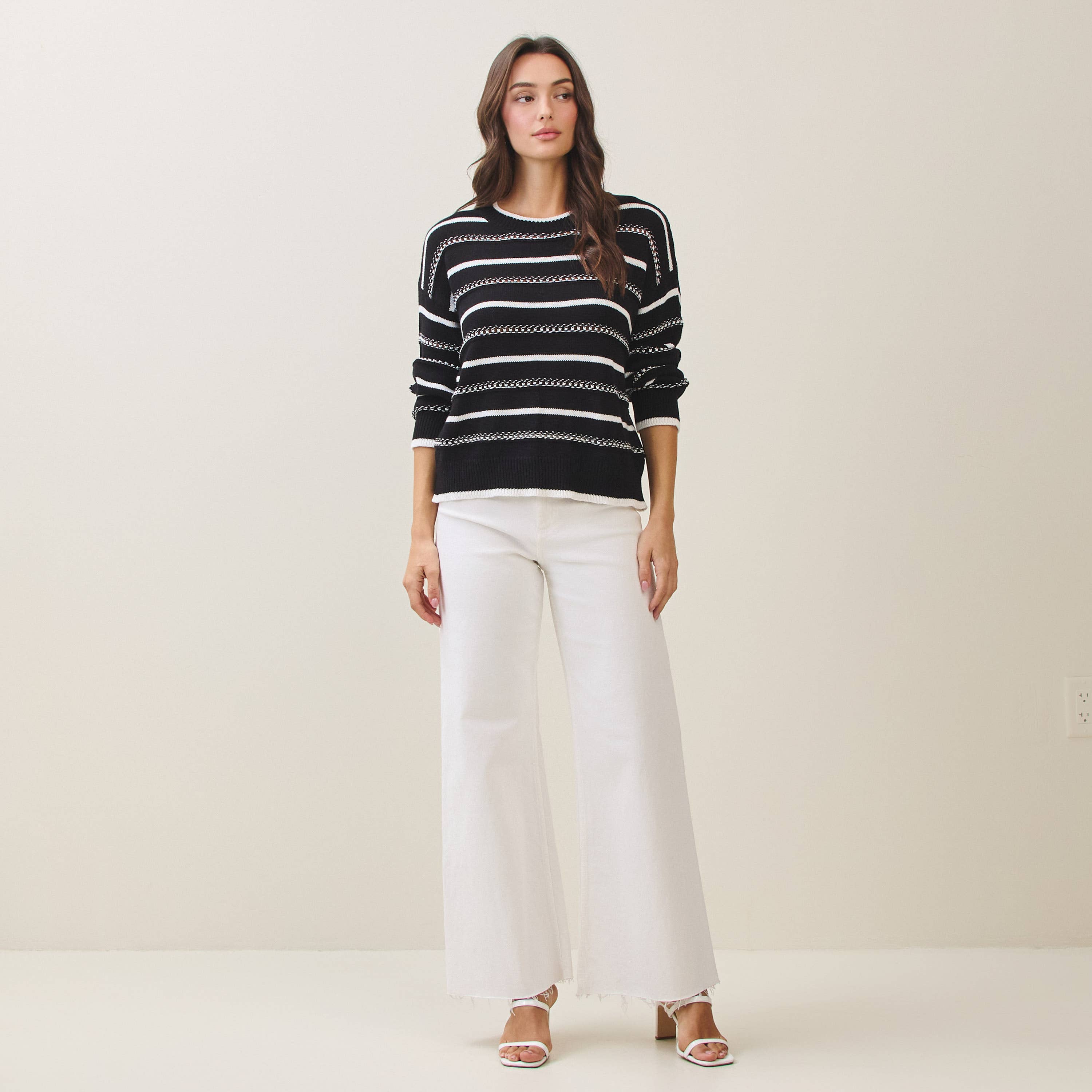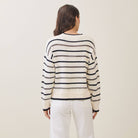 Elevate your wardrobe with the Navy Striped Knit Sweater, an exquisite embodiment of effortless sophistication. This lightweight garment, adorned with a delicate crochet pattern and rhythmic stripes, serves as an impeccable companion for transitional seasons, exuding an air of casual elegance while enveloping you in sublime comfort.