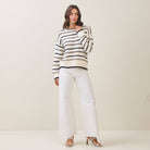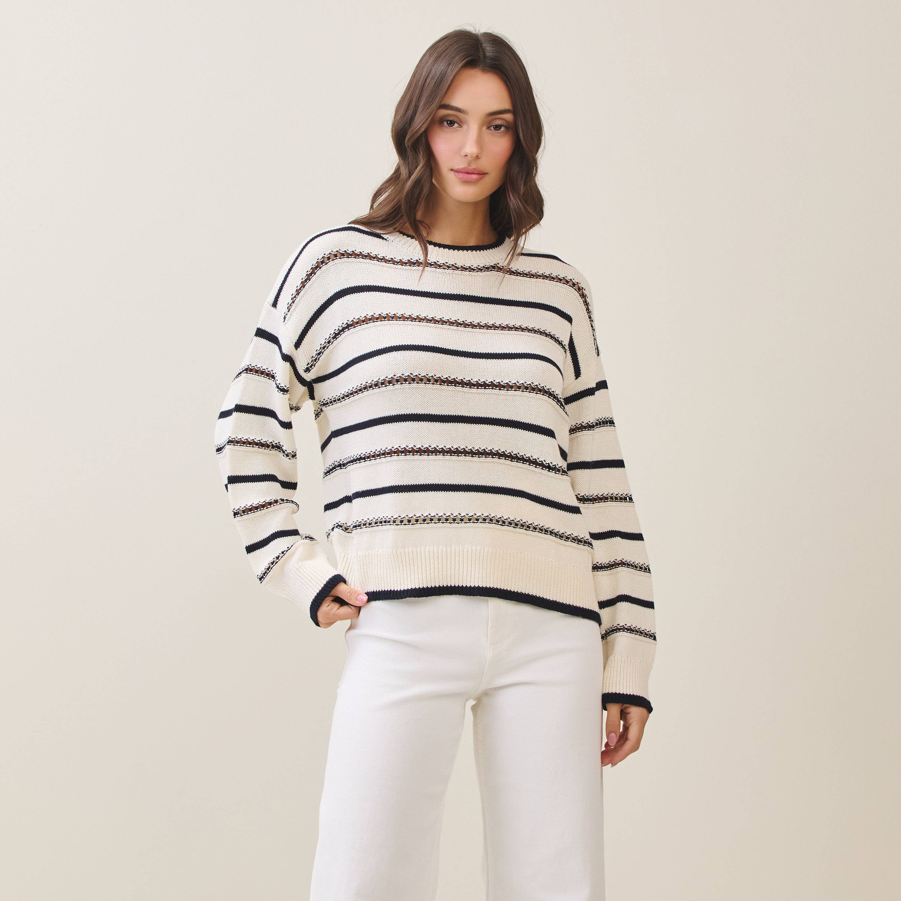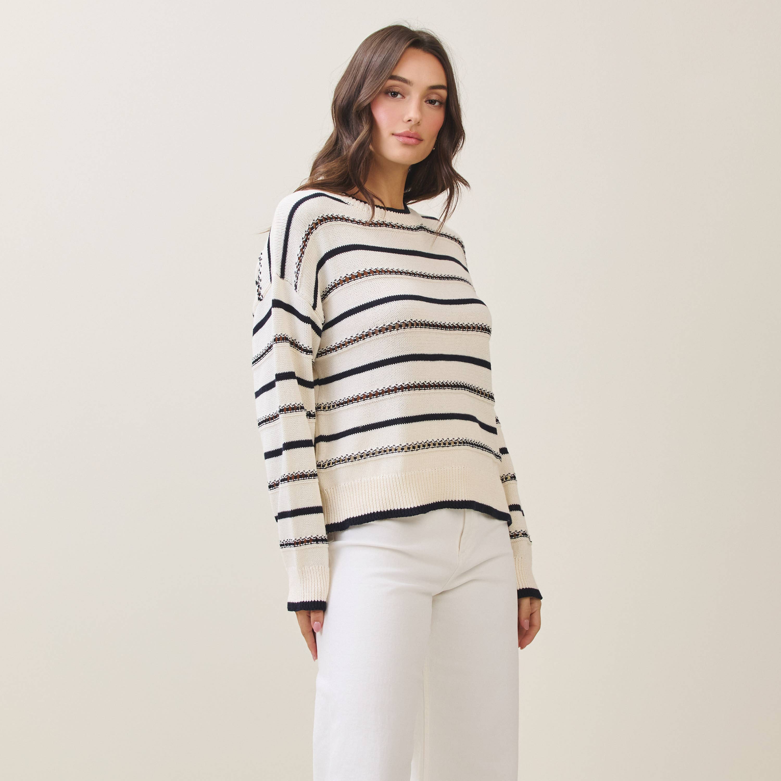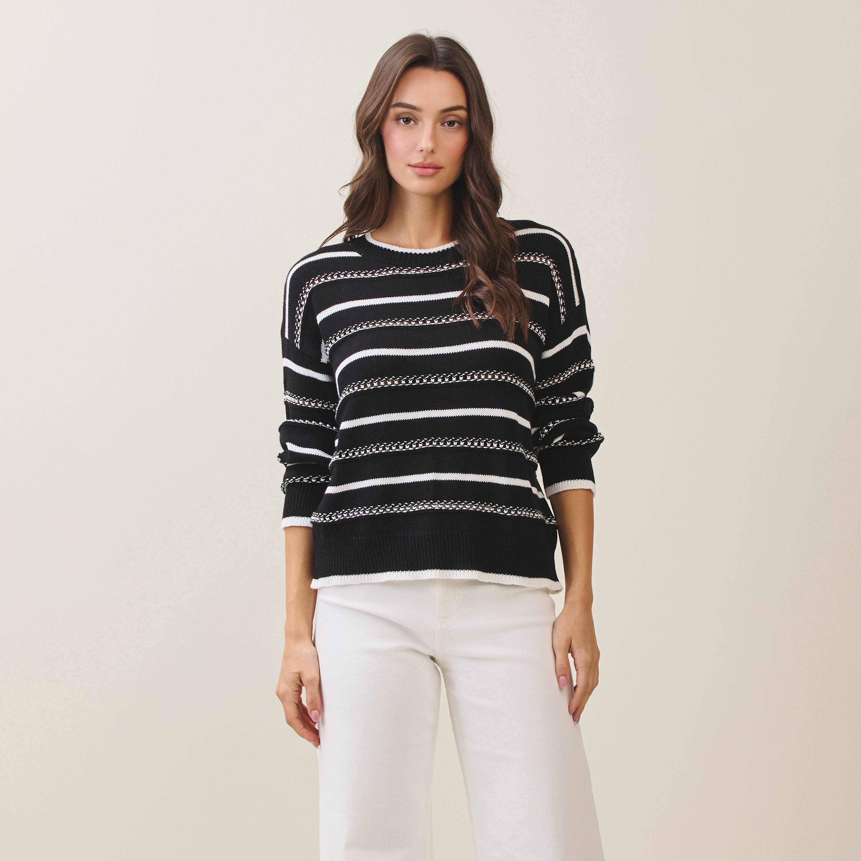 Elevate your wardrobe with the Navy Striped Knit Sweater, an exquisite embodiment of effortless sophistication. This lightweight garment, adorned with a delicate crochet pattern and rhythmic stripes, serves as an impeccable companion for transitional seasons, exuding an air of casual elegance while enveloping you in sublime comfort.