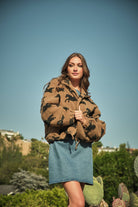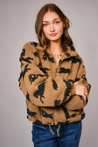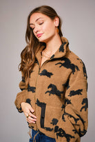 Stay warm and stylish with our Wild Horses Sherpa Oversized Zip-Up Jacket. Featuring an allover wild horse motif, this plush jacket adds a playful Western twist to any outfit. With its high collar, drop shoulders, and adjustable drawcord hem, you'll stay cozy and comfortable while making a fashion statement. Made with 100% polyester, this jacket is perfect for cold weather. Model is 5'8" tall and wearing size Small.