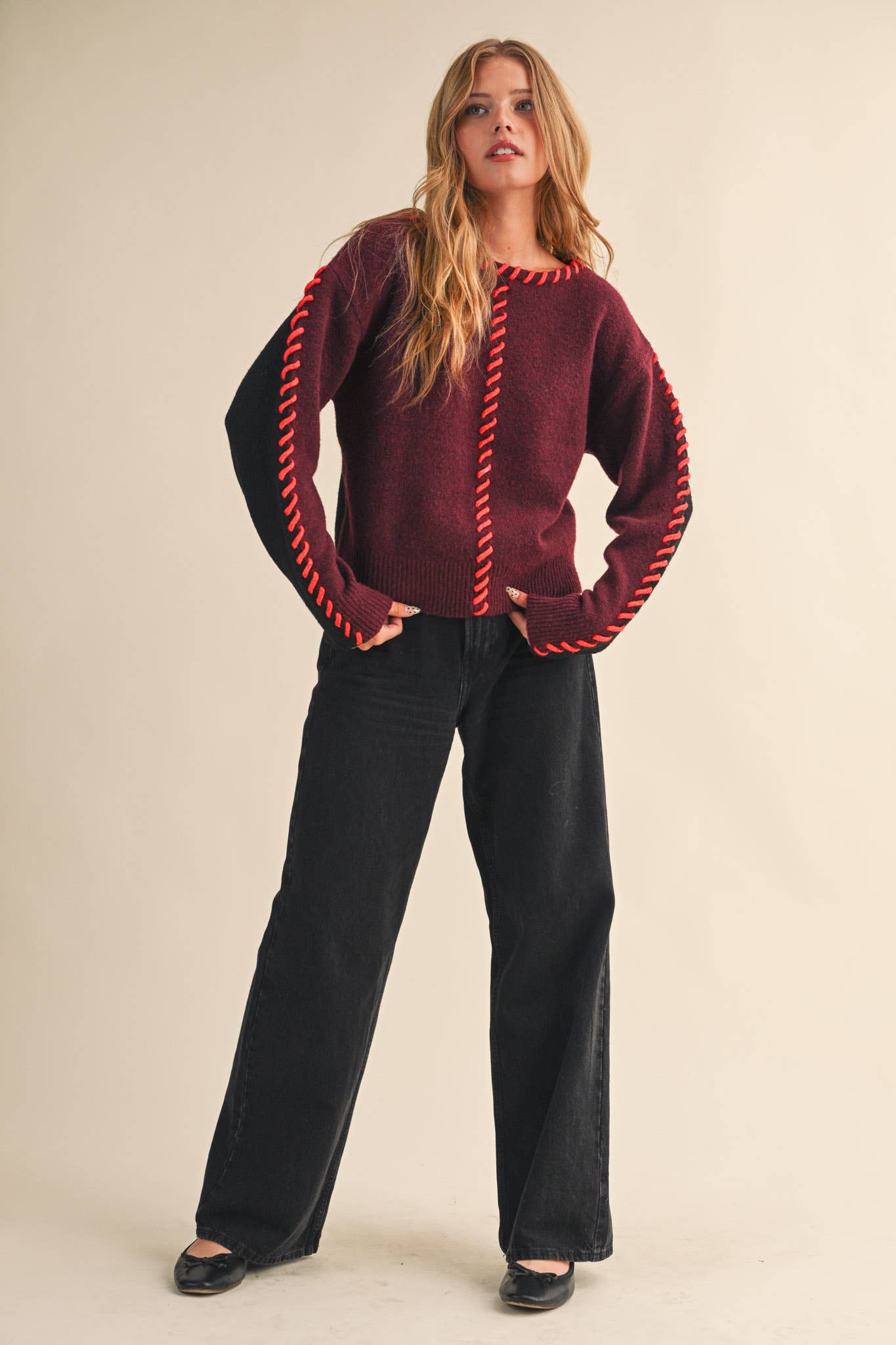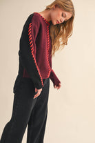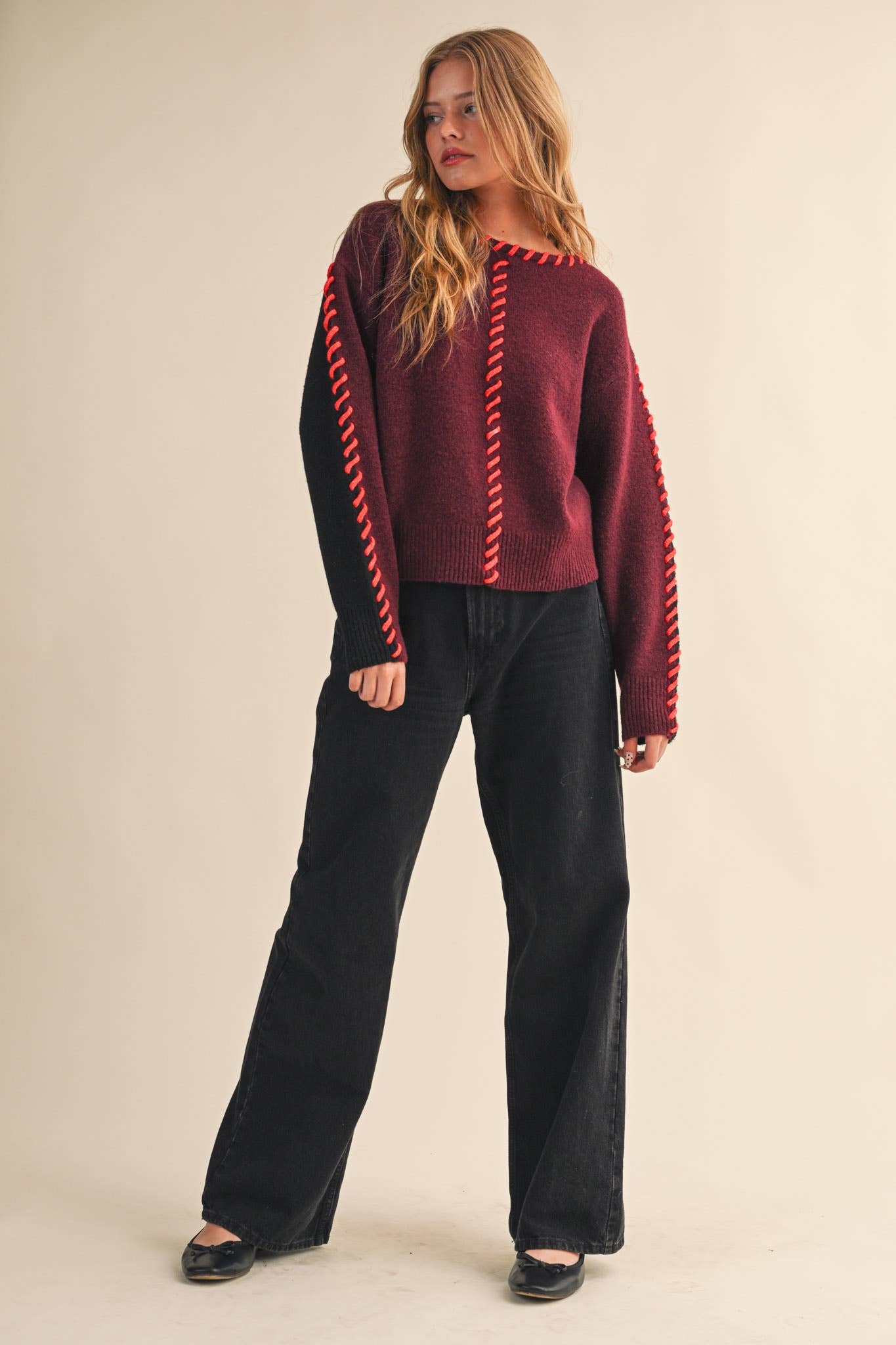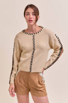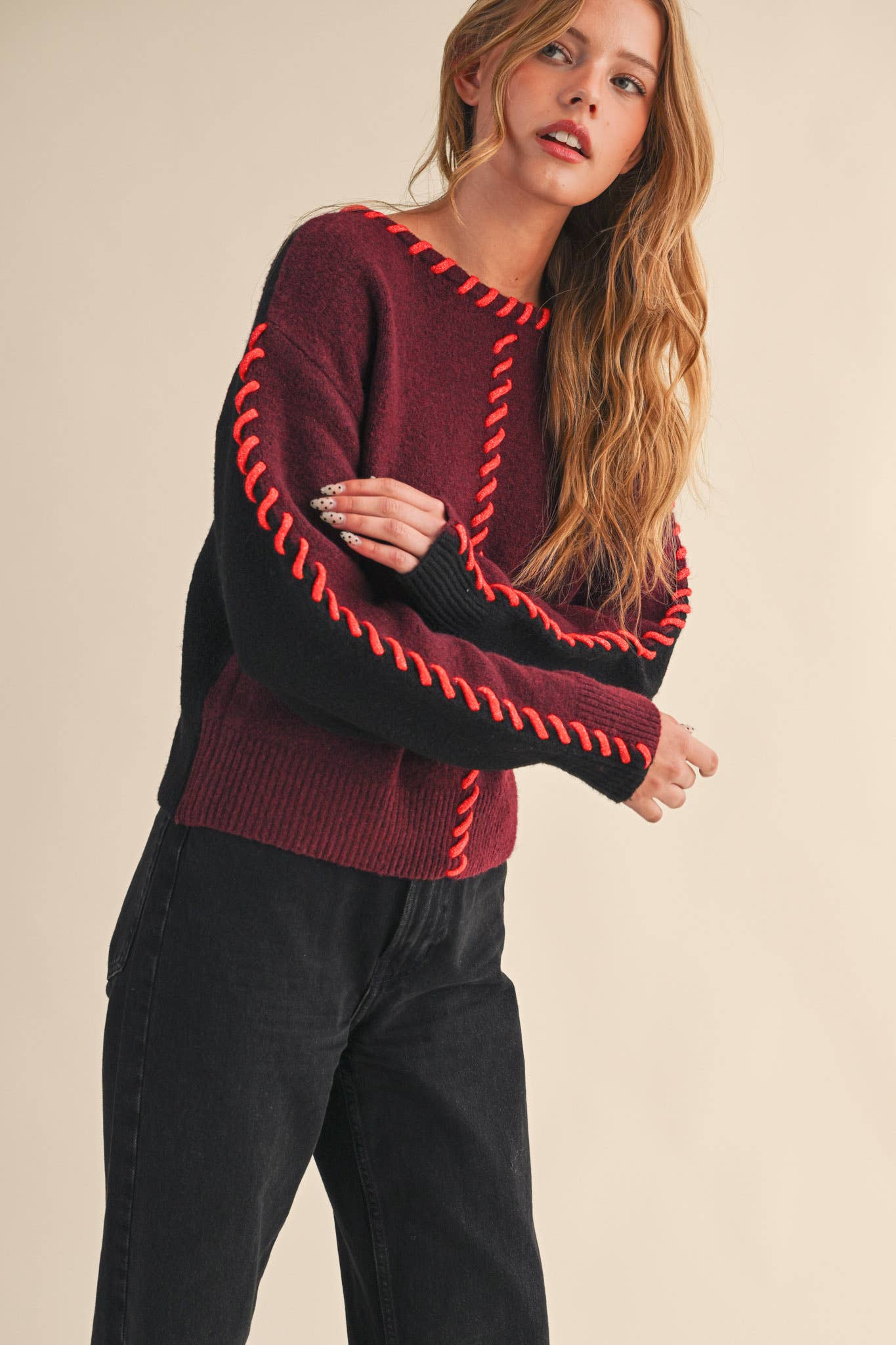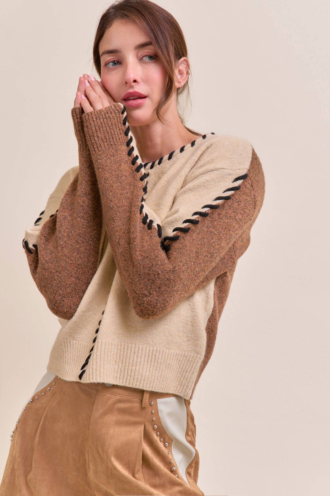 Create high-quality ensembles with this whip stitch two-tone sweater. The cozy knit fabric features a unique two-tone design on the front and back. Drop shoulder long sleeves and a boat neckline add to the relaxed bodice. A contrasting whip stitch detail accents the neckline, sleeves, and center front. Simply combine this sweater with your preferred bottoms for a versatile and stylish outfit.