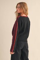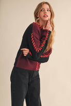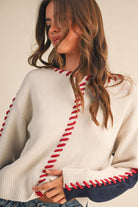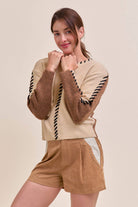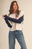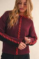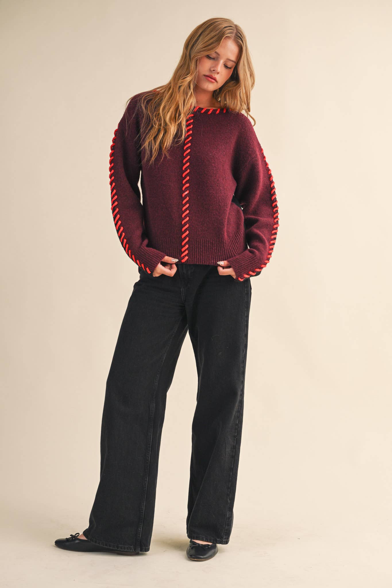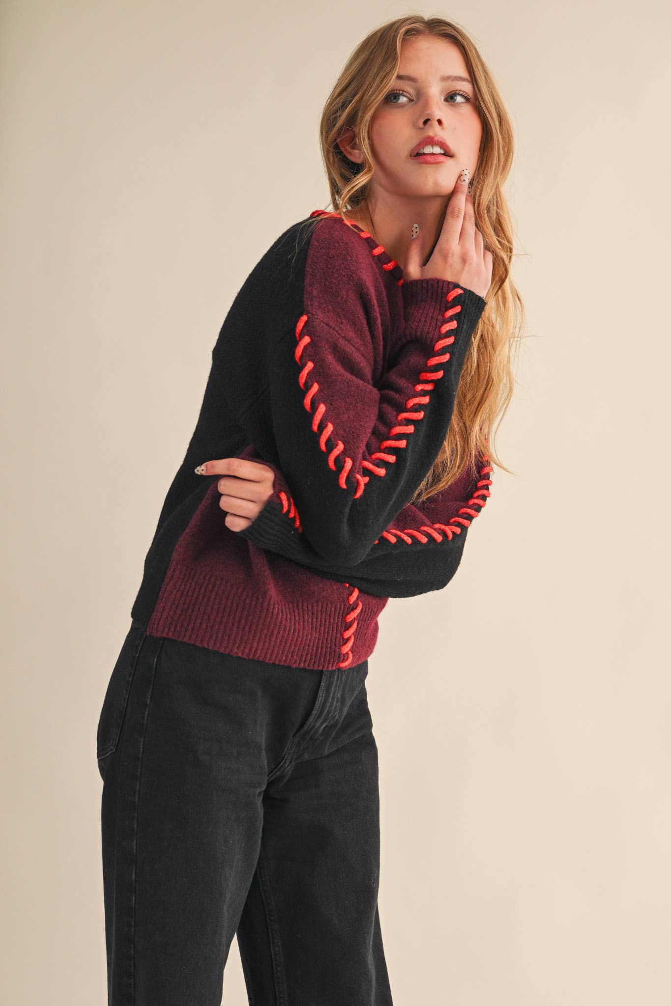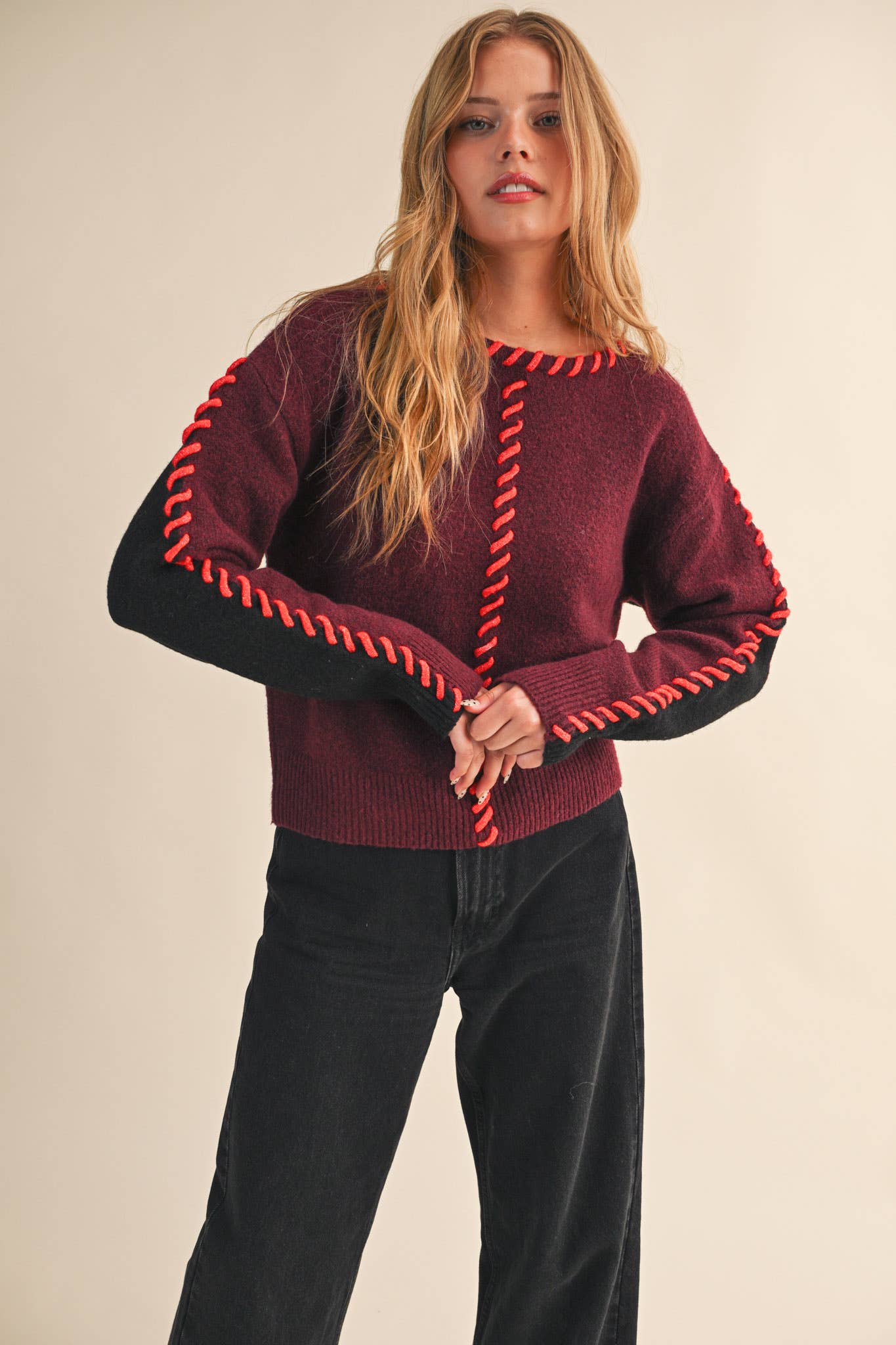 Create high-quality ensembles with this whip stitch two-tone sweater. The cozy knit fabric features a unique two-tone design on the front and back. Drop shoulder long sleeves and a boat neckline add to the relaxed bodice. A contrasting whip stitch detail accents the neckline, sleeves, and center front. Simply combine this sweater with your preferred bottoms for a versatile and stylish outfit.